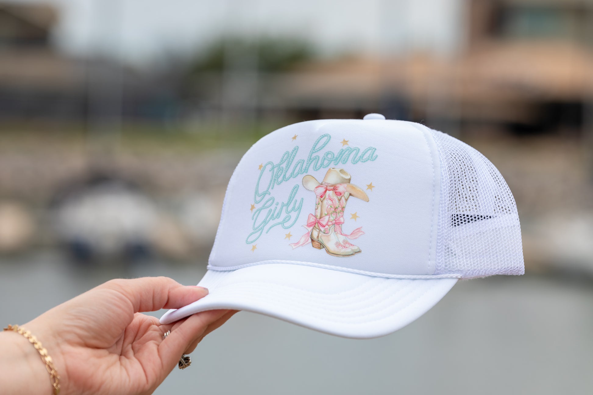 Saddle up and embrace your inner cowgirl with the Oklahoma Girly trucker hat. Perfect for rodeos and everyday wear, this white Otto hat features a cute Oklahoma design that will add a playful touch to any outfit. Yeehaw!