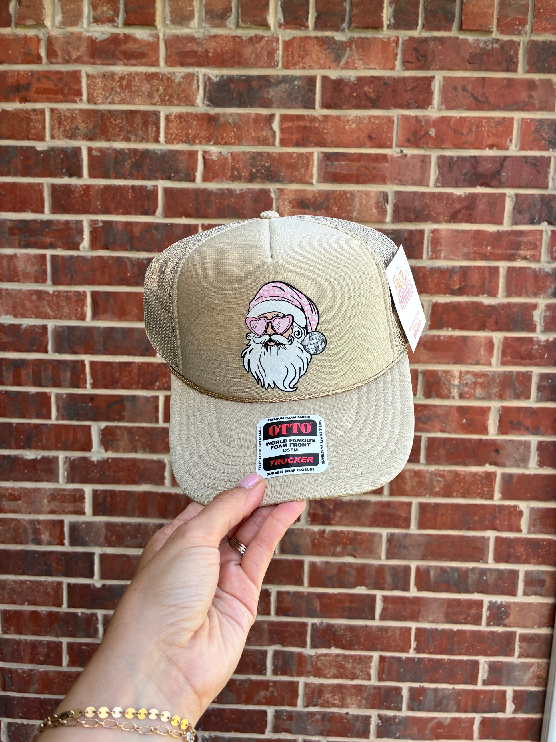 Enhance your holiday style with the Pink Santa trucker hat. This festive accessory features a unique design of Santa in a soft pink hue, adding a touch of playfulness to your look. Made with high-quality material, it offers both style and comfort for any occasion.